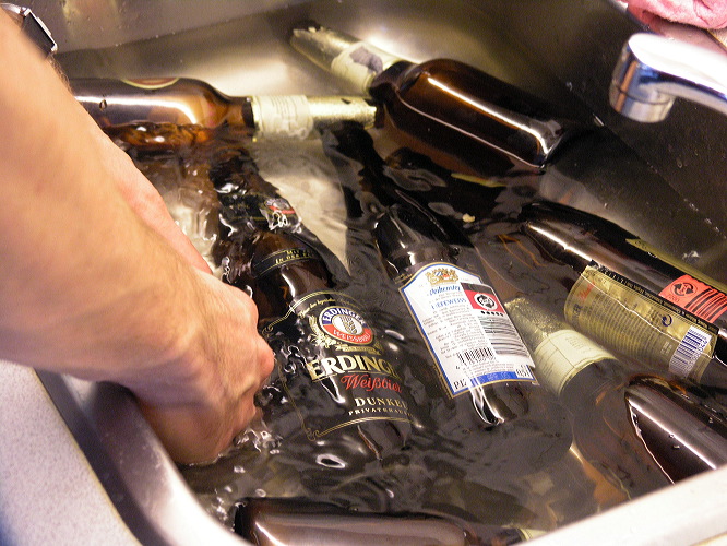 | Flaskerensning. Brygget skal hældes på flasker. De skal først renses: Etiketterne tages først af, hvorefter vi nedsænker flaskerne i kogende vand. Det er nemlig ikke godt, hvis flaskerne indeholder urenheder, for så er hygiejnen under brygningen og gæringen jo spildte kræfter.